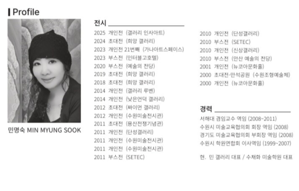 2025 개인전(갤러리 인사아트 1층), 2024 초대전(희망갤러리), 2023 개인전 21번째-(가나아트스페이스), 부스전 (인터불고호텔), 2020 부스전(예술의 전당), 2019 초대전(희망 갤러리), 2018 초대전(희망 갤러리), 2014 개인전(갤러리 루벤), 개인전(낮은언덕 갤러리), 2012 초대(싸이먼갤러리), 개인전(수원미술전시관), 2011 초대전 (용산전쟁기념관), 개인전(단성갤러리), 개인전(수원미술전시관), 부스전-SETEC, 2010 개인전(단성갤러리), 부스전(SETEC), 개인전(신상갤러리), 부스전(안산 예술의 전당), 2001 개인전(뉴코아문화홀) 2000 초대전-만석공원(수원조형예술제), 개인전 (뉴코아문화홀) 서해대겸임교수엮임(2008~2011), 수원시미술교육협의회 회장엮임(2008), 경기도미술교육협의회 부회장 엮임(2008), 수원시학원연합회 이사엮임(1999~2007),현재, 민갤러리 대표이자, 수채화 미술학원 대표이다.