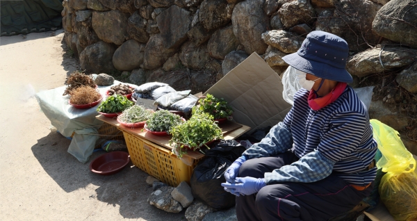 광양매화마을 자연산각종나물 파는아낙네 나물을 안팔고 휴데폰만보고있네