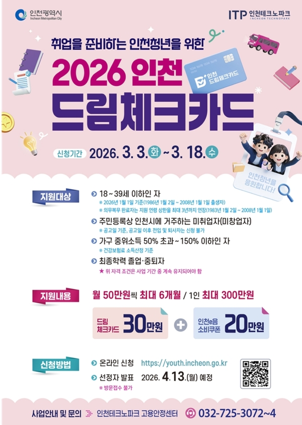 인천광역시는 미취업 청년의 구직활동을 지원하는 ‘2026년 드림체크카드 사업’ 참여자를 오는 3월 18일까지 모집한다.