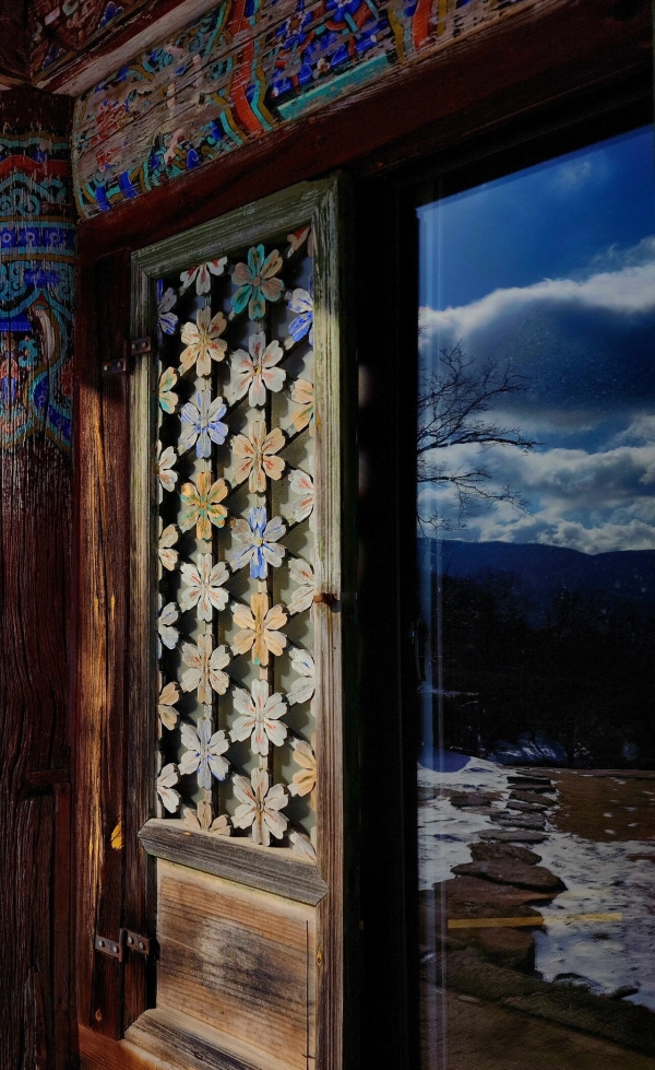 대적광전 앞에서 뜻밖의 풍경을 만났다. 열린 꽃문에 또 하나의 세상이 열려 있었다. 유리창이 거울이 되어 머금은 풍경이다. 이 그림은 단순한 반영이 아니다. 절대고독의 시간 속에서 만물이 서로를 온전히 승인하는 현장이다. 또 한편으론 수도암이 겨울을 나는 진솔한 생활상을 가감 없이 드러낸 모습이기도 하다.