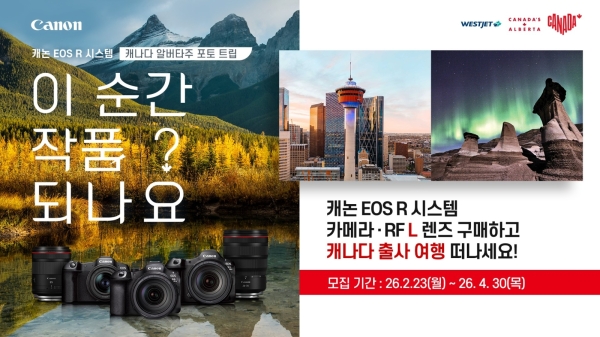 이번 프로그램은 4월 30일(목)까지 EOS R 시스템 카메라 또는 RF L 렌즈를 구매한 고객을 대상으로 진행되는 참여형 출사 프로젝트로, 캐논코리아는 총 8명의 참가자를 선발해 오는 6월 1일(월)부터 6월 7일(일)까지 5박 7일 일정으로 캐나다 알버타주의 대표 명소를 촬영하는 포토 트립을 운영한다. 캐나다관광청, 알버타주관광청, 항공사 웨스트젯(Westjet)과 협력해 화제의 드라마 속 알버타의 웅장한 자연 풍광을 직접 경험하고 촬영할 수 있도록 기획했다.