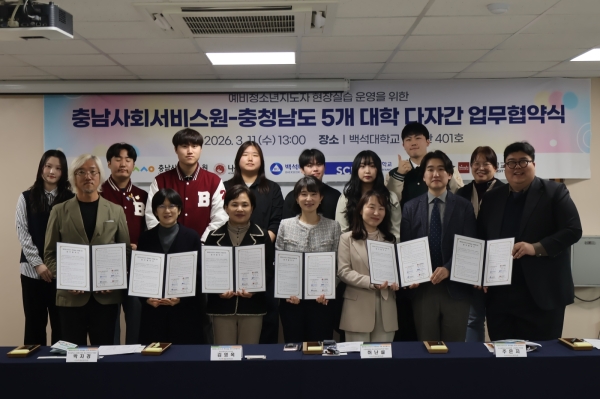 충남사회서비스원(원장 김영옥)은 3월 11일(수) 백석대학교에서 5개 대학 청소년관련학과 △나사렛대학교 △백석대학교 △순천향대학교 △청운대학교 △호서대학교와 「예비청소년지도자 현장실습 운영 관련 업무협약」을 체결했다고 밝혔다.