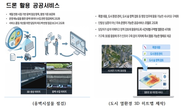 이와 함께 공공서비스 분야에서는 드론을 활용한 옹벽 시설물 점검과 도시 열환경 3D 히트맵 제작 등 다양한 실증사업을 추진한다. 이를 통해 위험 시설 관리의 안전성을 높이고 도시 환경 데이터 수집 효율을 높여 행정 서비스 혁신을 도모할 계획이다.