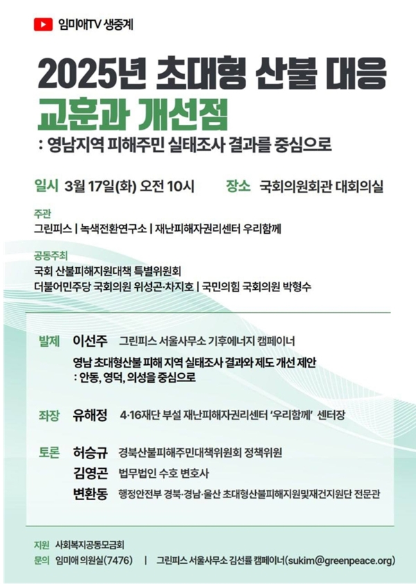 이러한 분석 결과를 바탕으로, 기후위기 시대에 부합하는 국가 재난 대응 시스템의 근본적 전환을 논의하고자 317() 오전 10, <2025년 초대형 산불 대응 교훈과 개선점> 국회 토론회를 개최한다.