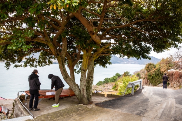 김재연 선장과 이재언 소장은 11시에 예배보러 교회에 가고, 나머지 일행은 봉통마을길 여기저기를 걸어본다. 발 아래 남쪽으로는 금오도가 밟힐 듯 지척이다. 비렁길 출발점인 함구미항도 시야에 잡힌다. 교회 바로 아래 큰 나무 쉼터가 보인다. 주민에게 물어보니 후박나무라고 한다. 평상에 앉아 잠시 쉬면서 경관을 즐긴다.