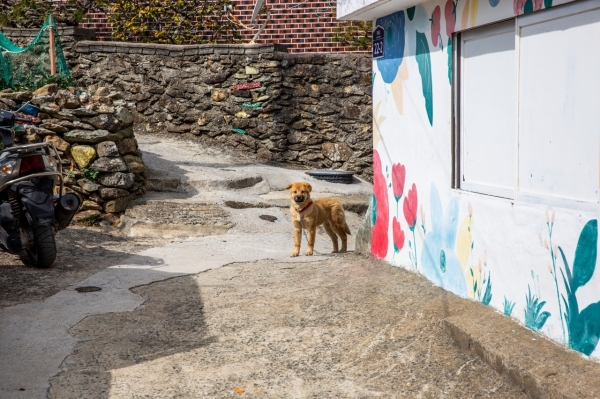 꽃그림 벽화도 있다. 강아지 한 마리 꽃을 지키듯 코너에 서 있다. 강아지 역시 섬 주민이다. 섬 모양이 콩같이 생겼다 해서 ‘두라도(豆羅島)’ 라는 이름이 붙여졌다고 한다.