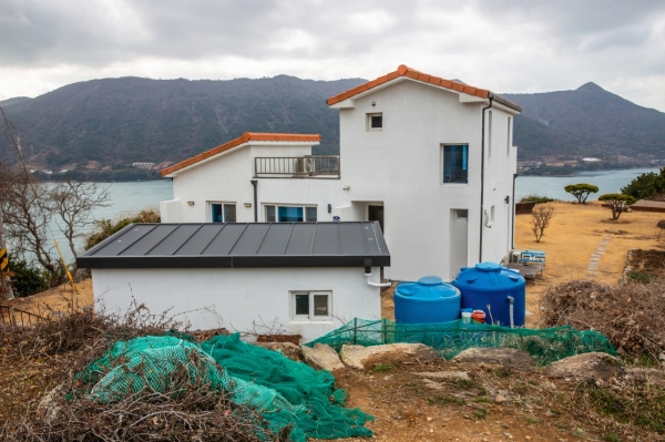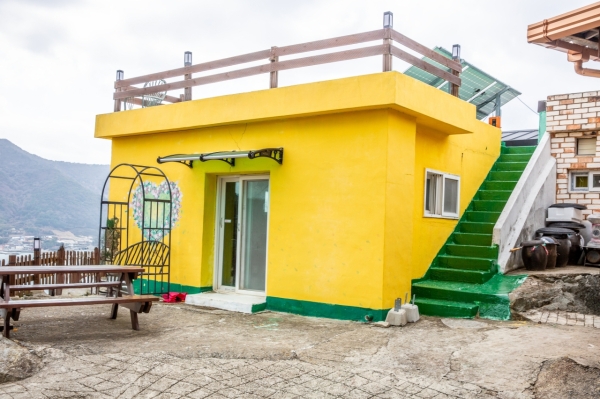 정면으로 노란담벽에 주황색 지붕의 조그만 집이 보인다. 위치도 참 좋다. 마치 테라스에 앉아 있는 집 같다. 바다와 금오도를 팔벌려 가슴 가득 안고 사는 집 아닌가?