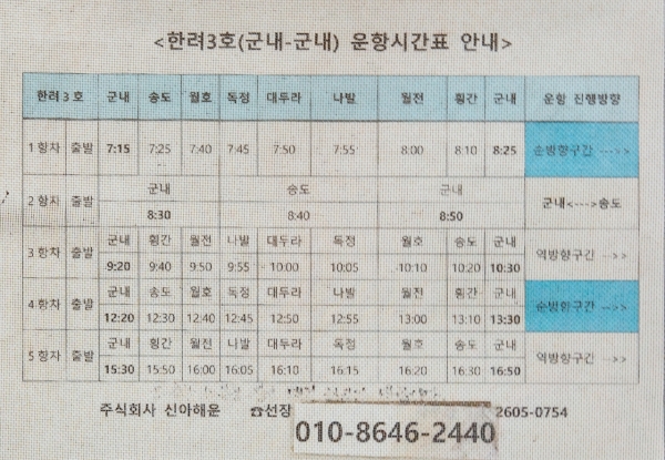 우리 일행은 일정관계상 작은 어선을 빌려 나발도-대두라도-월호도 등을 돌아봤지만, 시간여유가 있는 여행객들은 여수 군내항에서 출항하는 정기여객선 한려3호(신아해운 010-8646-2440)를 타면 된다. 이 여객선은 7시 15분 1항차부터 15시 30분 5항차까지 군내-송도-월호-독정-대두라-나발-월전-횡간-군내로 돈다.