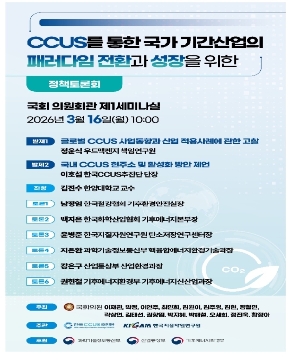 이재관 의원(충남 천안을·더불어민주당)은 오는 16일 오전 10시에 국회의원회관 제1세미나실에서 박정, 이언주, 최민희, 김원이, 김주영, 김현, 장철민, 곽상언, 김태선, 권향엽, 박지헤, 박해철, 오세희, 정진욱, 황정아 의원이 주최하고 한국CCUS추진단, 한국지질자원연구원이 주관하는 <CCUS를 통한 국가 기간산업의 패러다임 전환과 성장을 위한 정책토론회>를 개최한다고 밝혔다.