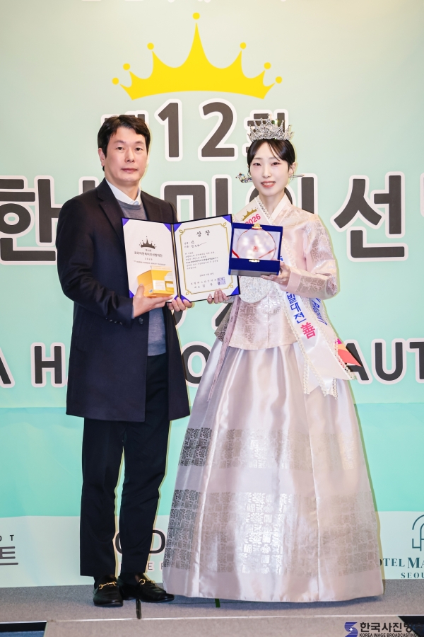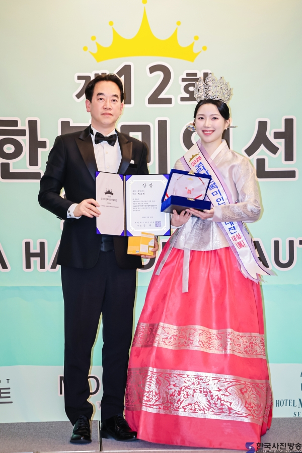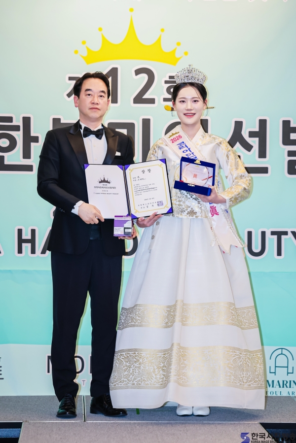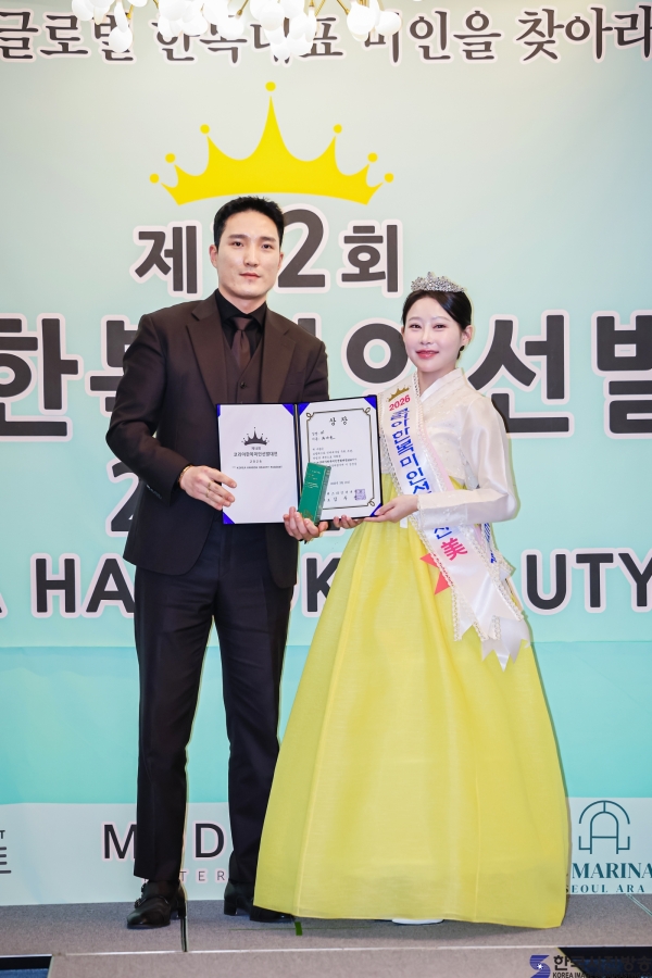 스마트너스 하재호 대표와 ‘코리아한복미인선발대전 2026’ 인기상 권가린/ 이한철 기자