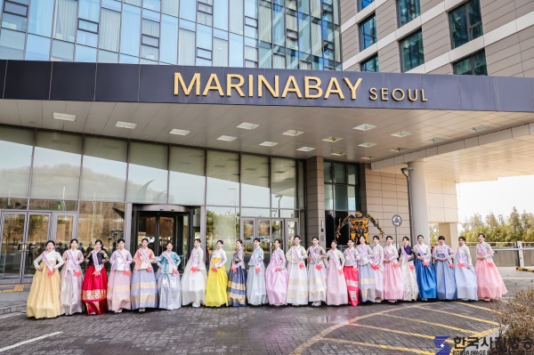 호텔마리나베이코리아 영업본부 한진현 과장과  ‘코리아한복미인선발대전 2026’ 미 전보라/ 이한철 기자