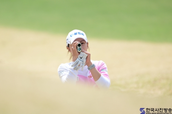 [포토] 송지아...18번홀 벙커에서 깃대까지 거리를 측정한다.