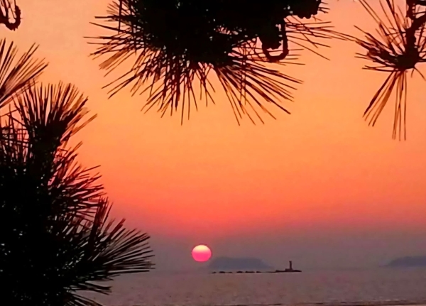 수평선 너머 일몰 빛 고요히 물드네
