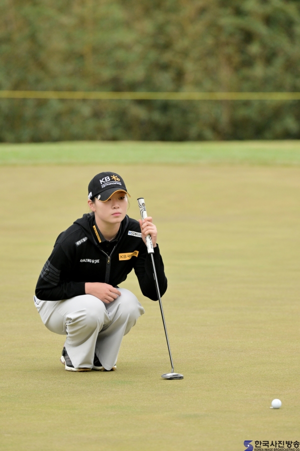 방신실 프로가 10번홀 그린에서 퍼팅 라인을 살피고 있다.