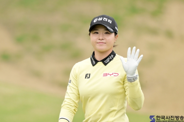 고지원  프로가 1번 홀에서 그린으로 향하면서 카메라에 손을들어 인사하고 있다.