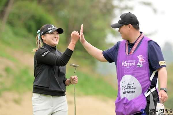 리슈잉(중국) 프로가 첫 홀에서 버디에 성공하고 캐디와 하이파이브를 하고있다.