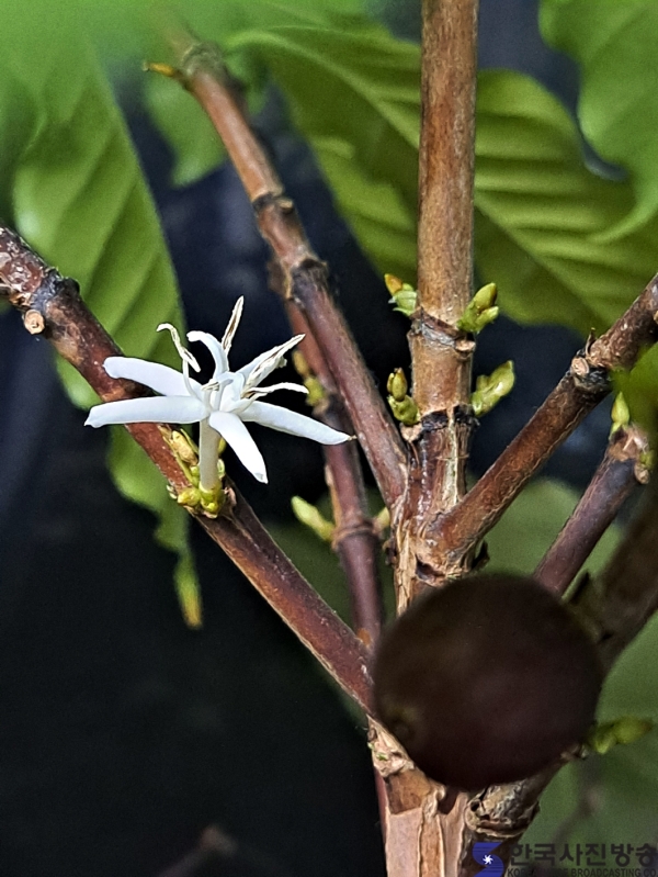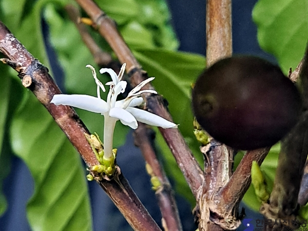 그전에 이미 커피열매가 3개가 달려 있었는데 꽃을 보지못한 탓에 크게 반가웠다 이 커피나무는 인천시로부터 202245일 문학터널위 문학공원이 조성되면서 기념선물로 받은 나무로 필자가 정성을 다해 돌봐왔다.