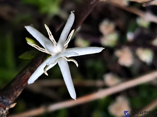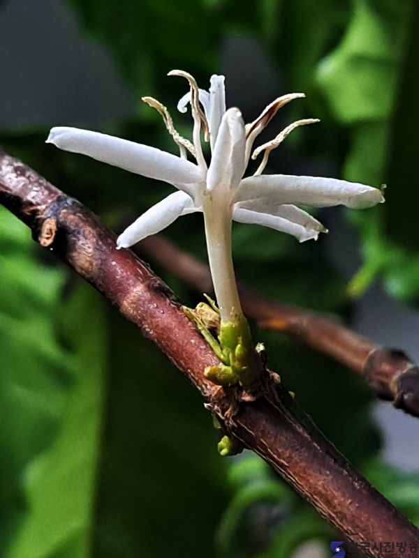 17일 새벽 2시에 커피꽃을 생전 처음 봤고 사진촬영을 했다. 침실 창가에 둔 커피나무는 열대수목으로 겨울철을 나기위해 실내에 들여놓은 장소에서 개화가 된 것이다.