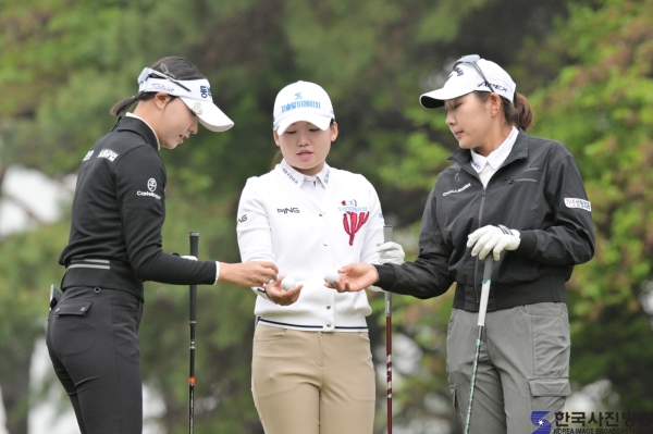 문정민, 오경은, 박단유 프로가 1번홀 티박스에 올라와서 서로의 볼 마크를 확인하고 있다.