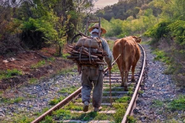 황소가 고삐에 이끌려 함께 철길을 걷고 있다.