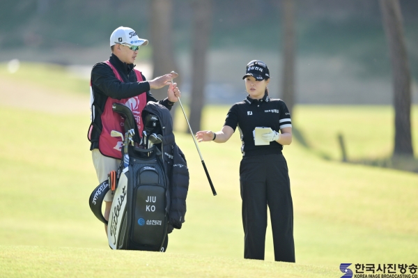 고지우 프로가 1번홀에서 세컨드 샷을 하기위해 캐디에게서 클럽을 건내받고 있다.