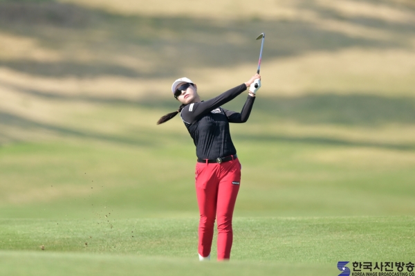 김우정 프로가 18번 홀에서 그린을 향해 아이언 샷을 하고있다.
