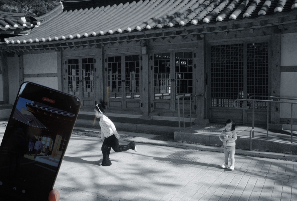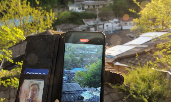 [[[정릉골 폐가촌이라는 장소는 이미 시간의 퇴적층이다. 삶이 빠져나간 자리, 그러나 완전히 사라지지 못한 흔적들. 그 위에 또 하나의 시간 장치를 들이민다. 손에 쥔 핸드폰, 그것은 단순한 프레임이 아니라 현재를 생산하는 기계다. 뉴스, 기록, 예측, 알고리즘모든 것이 이 작은 화면 안에서 실시간으로 재구성된다. 그렇게 폐허의 시간과 디지털의 시간이 한 화면에서 충돌한다.