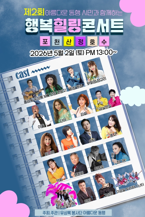 봉사단체 ‘아름다운 동행’은 오는 2026년 5월 2일 오후 1시, 경기도 포천 산정호수 특설무대에서 ‘제2회 아름다운 동행 시민과 함께하는 행복힐링콘서트’를 개최한다고 밝혔다.