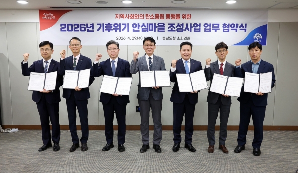 홍종완 도 행정부지사는 29일 도청 소회의실에서 송무경 공주시 부시장, 신필승 서산시 부시장, 황침현 당진시 부시장, 이주영 태안군 부군수, 엄경일 한국서부발전 기술안전부사장, 김정배 에스피삼화 사업총괄(CBO)과 ‘지역사회와의 탄소중립 동행을 위한 기후위기 안심마을 조성 사업’ 업무협약을 체결했다.
