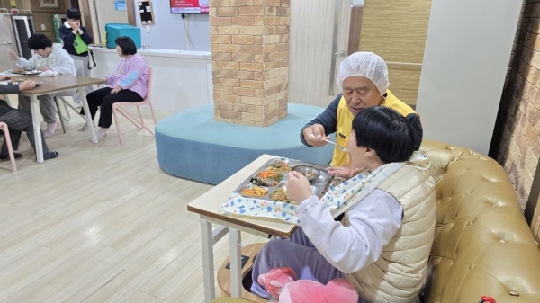 중증 소아마비 장애인과 지적장애인들에게 직접 밥을 떠먹여주며