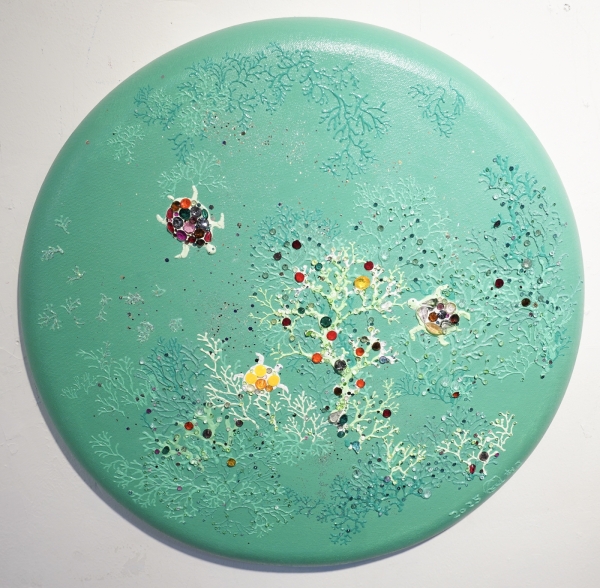 채 작가가 이번 초대전에서 선보이는 작품들에는 생명의 환희와 에너지가 가득합니다. 최근 건강상의 이유로 생사(生死)의 경계를 넘나들었던 작가는 목표와 성취에 쫒기던 삶을 내려놓은 덕분에 삶을 관조하는 여유와 희망이 더 생겼다고 했습니다. 작품에도 그런 흔적이 배어 있습니다. 반짝이는 보석들을 등에 가득 짊어진 채 자유롭게 헤엄치는 거북이들을 통해서는 장수와 건강을 기원합니다. 바닷속 풍경을 담은 원형이나 타원형의 화면은 그 자체로 지구를 닮았습니다.