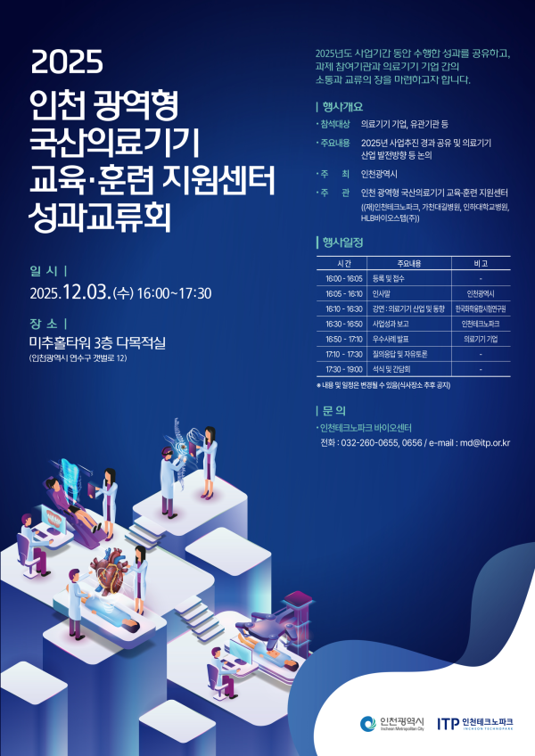 인천광역시(시장 유정복)는 12월 3일 송도 미추홀타워에서 인천테크노파크(원장 이주호)와 함께‘2025 광역형 국산의료기기 교육훈련 지원사업 성과교류회’를 개최했다고 밝혔다.