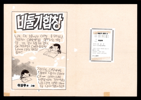 <비둘기 합창>이상무 화백(1946~2016)19784월부터 19796월까지 소년중앙에 연재한 작품으로, 한국 가족만화를 대표하는 걸작이다. 가난과 사회적 약자의 삶 속에서도 희망을 잃지 않고 살아가는 평범한 가족의 모습을 따뜻하고 진솔하게 그려내며 큰 반향을 일으켰다.