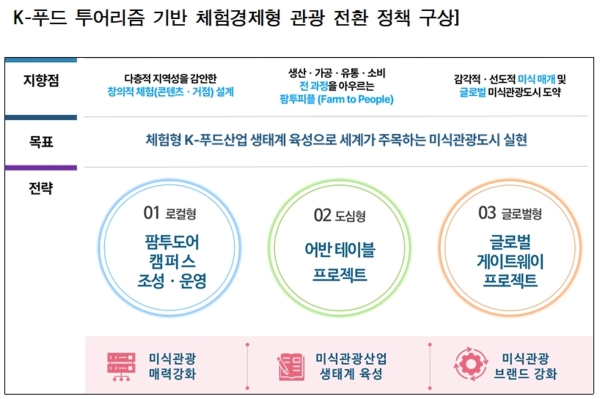 우선 농촌과 섬 지역을 중심으로는 식재료 생산과 음식 체험, 교육과 체류가 결합된팜 투 도어(Farm to Door) 캠퍼스조성운영 방안을 제시했다. 이는 단순 농가 체험이 아니라, 지역 농수산물 생산지에서의 체험, 조리가공 교육, 로컬 푸드 기반 식사와 상품화까지를 하나의 공간과 프로그램으로 묶는 방식이다. 이를 통해 관광객은 생산과정을 직접 경험하고, 지역은 안정적인 관광 수익과 산업 연계를 동시에 확보할 수 있을 것으로 분석했다.