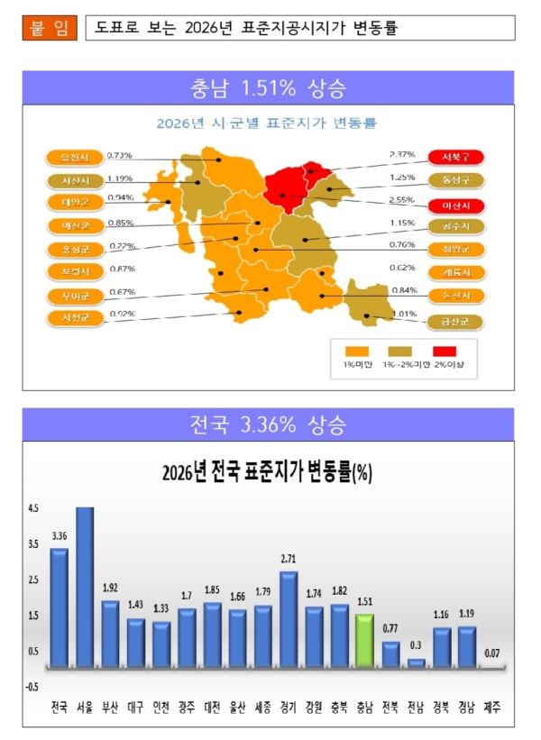 충남의 변동률은 지난해 1.44%에서 올해 1.51%로 상승했으며, 천안·아산 지역을 중심으로 각종 개발사업이 증가한 영향으로 분석된다.