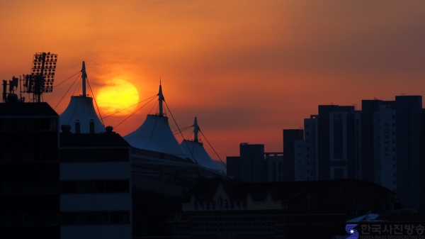 ▼ 문학경기장 지붕위로 떠오르는 태양