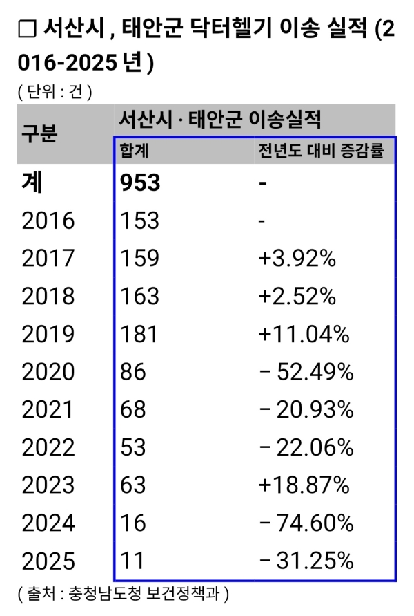 - 서산·태안 닥터헬기 이송실적, 2019년 181건 →2025년 11건으로 급감