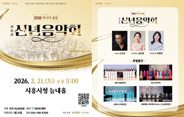 시흥시가 지원하고 (사)한국예술문화단체총연합회 시흥지회에서 주관하는 ‘2026 시흥시 신년음악회- 하나의 울림’이 오는 2월 21일 오후 5시, 시청 늠내홀에서 개최된다.