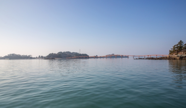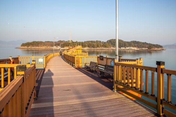 드디어 인도교 입구로 돌아왔다. 황금색 칼러로 구불구불 이어놓은 다리에는 중간중간 낚시를 할 수 있는 쉼터도 만들어놨다. 여행객들은 이곳에서 쉬기도 하고 주변바다풍경을 감상하기에도 좋다. 길이 560m, 폭 3m의 제법 긴 다리다. 곳곳에 시(詩)판도 여러개 걸어놨다. 인도교는 이제 여자도의 명물이 됐다. 우선 아름답다.