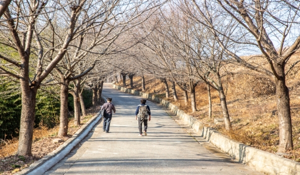 마파마을 안길을 돌아 대동마을 쪽으로 걷는다. 길이 아기자기하여 트레킹 맛이 좋다. 약간 비탈구간도 있고 내리막길도 만난다. 안내도엔 이곳 구간을 ‘개미허리길’이라고 표시해놨는데 실감이 간다. 벚꽃나무숲터널길도 지나간다. 벚꽃이 만발하는 봄철에 오면 더욱 아름다울 것 같다.