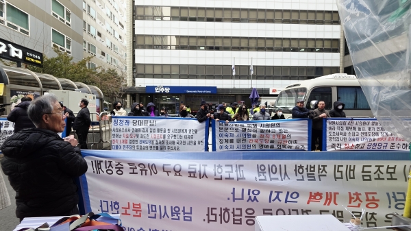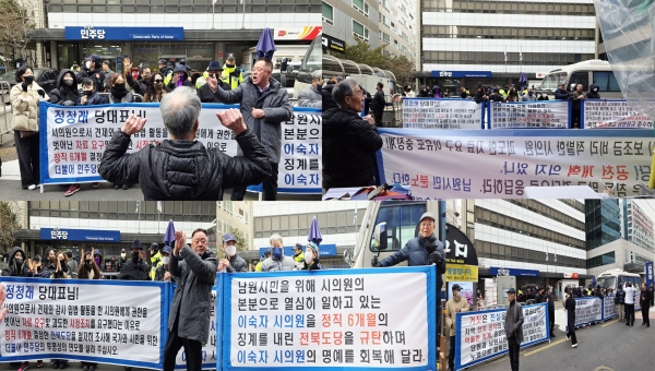 지난 2월 24일 서울 여의도 더불어민주당 중앙당사 앞에서 전북 남원시민 40여 명이 모여 이숙자 남원시의원에 대한 당원권 정지 6개월 징계의 철회를 요청하는 집회를 열었다.