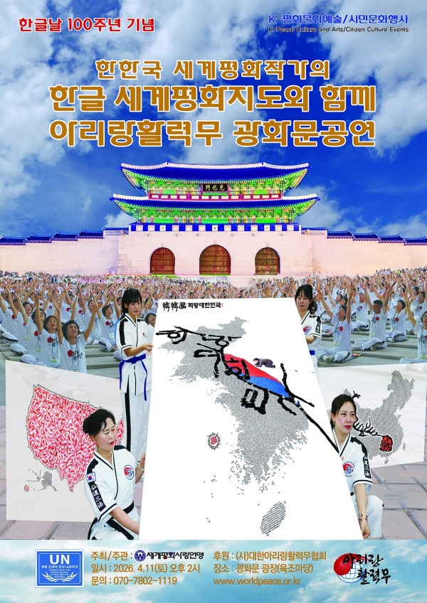 이번 행사는 세계평화사랑연맹이 주최·주관하고, ()대한아리랑활력무협회가 후원하며, 오는 411일 오후 2, 서울 광화문광장 육조마당에서 한글 세계평화지도 공연과 함께 아리랑활력무 건강체조가 펼쳐진다.