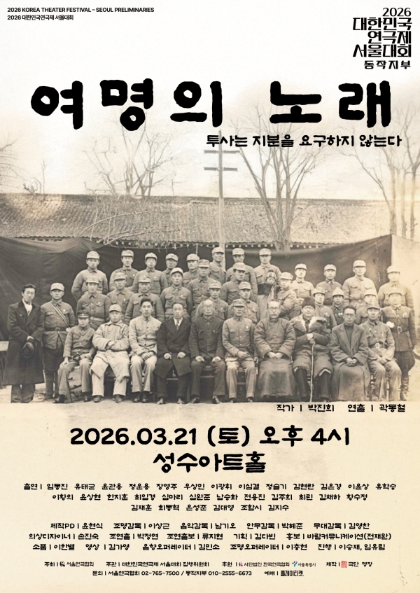 독립운동가들의 삶과 신념을 그린 연극 <여명의 노래 투사는 지분을 요구하지 않는다> 가 오는 2026321일 토요일 오후 4시 성수아트홀에서 공연된다.
