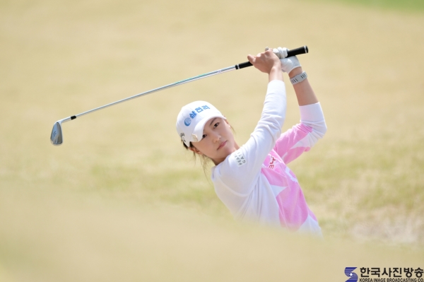 송지아 프로가 18번 홀 페어웨이 벙커에서 그린을 향하여 아이언 샷을 보내고 있다.
