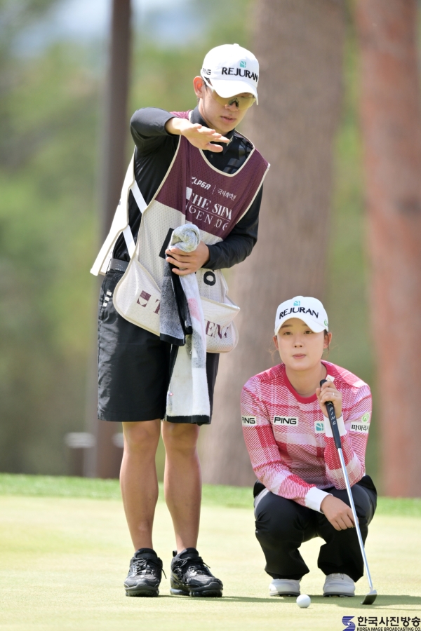 마서영 프로가 18번홀 그린에서 캐디와 그린의 경사를 의논하고 있다.