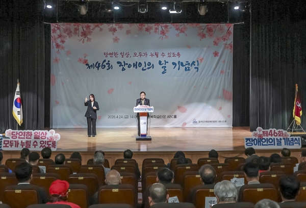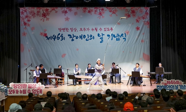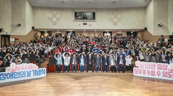 ▲ 제46회 장애인의 날 기념식에서 참가자들이 단체 기념촬영을 하고 있는 모습