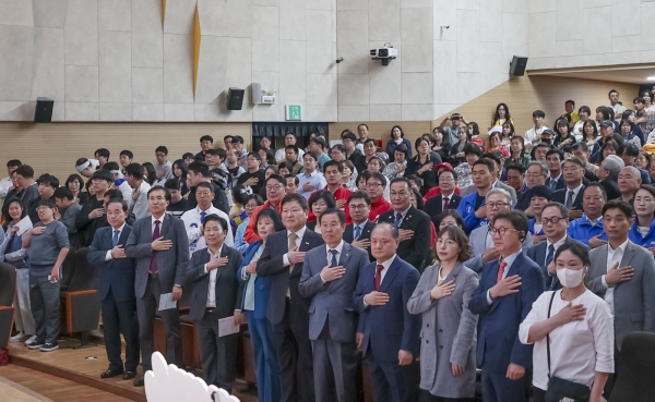 ▲ 국민의례에서 애국가를 부르며 가슴에 손을 얹고 있는 참가자들